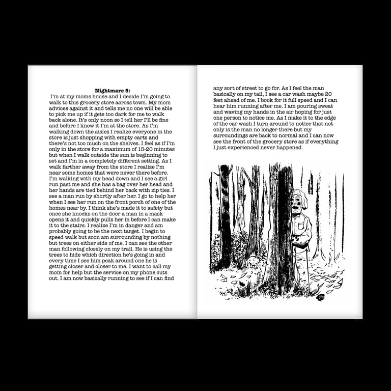 This zine is a collection of nightmares transcribed from Ashleigh Gillis from over the past 3 years, accompanied with illustrations by Chris Wilson.